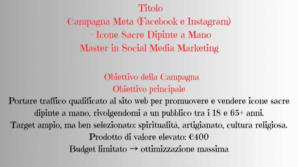 Ho completato un Master professionale in Digital Marketing, con focus su strategie di comunicazione online, advertising e gestione dei social media. Non ho ancora esperienze lavorative in agenzie o aziende, ma ho costruito da zero un progetto personale che mi ha permesso di mettere in pratica tutte le competenze apprese: ValyArteSacra.