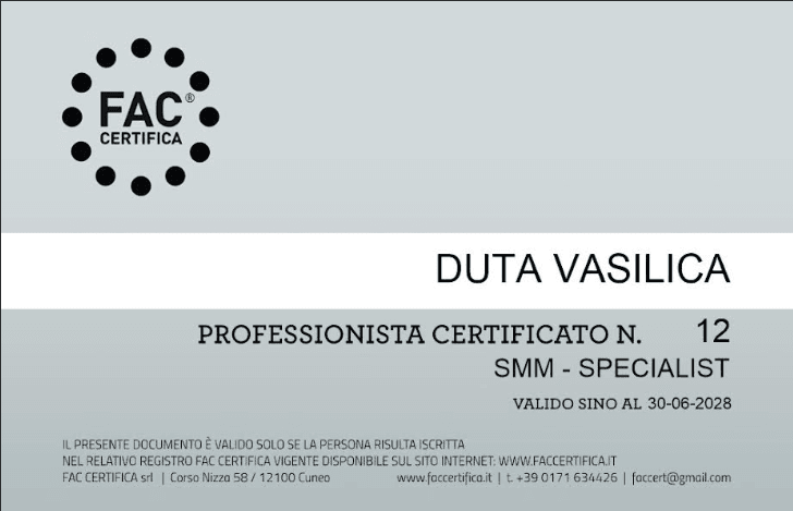 Mi chiamo Duta Vasilica, sono una professionista certificata in Social Media & Performance Marketing, iscritta ufficialmente nel registro dei professionisti del settore.